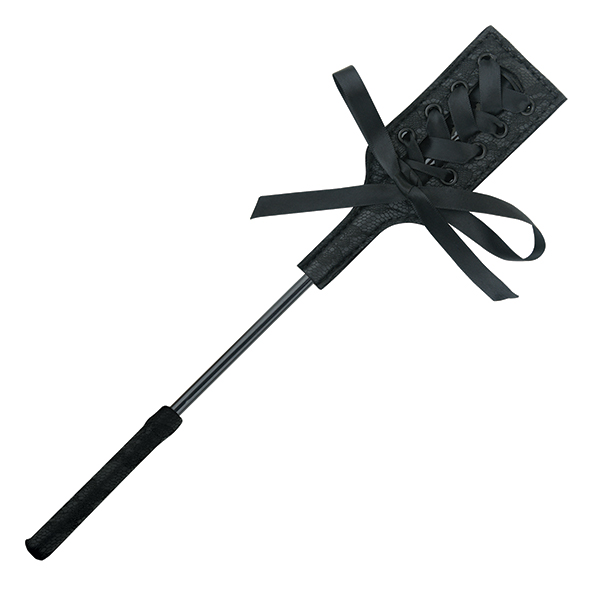 Der Kopf dieser stilvollen, schlanken Peitsche ist mit einem luxuriösen Spitzenstoff überzogen und mit einem aufwändigen schwarzen Korsettband und einer Satinschleife verziert.